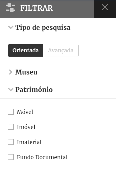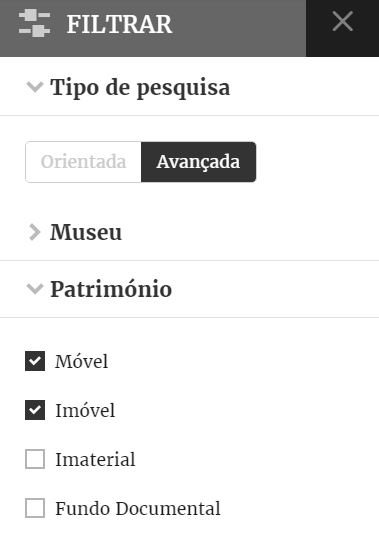 Permite selecionar os registos de património móvel, património imaterial, património imóvel e fundo documental de todos os Museus ou de um Museu combinando o critério anterior.