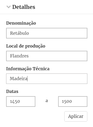 Pesquisa pela denominação do objeto, constituída pela sua designação formal (ex: ampulheta, harpa, vestido, relógio, etc.), de uma manifestação do património imaterial, de um imóvel ou de um fundo documental ou pelo respetivo Título, quer o originalmente atribuído pelo autor, quer outro pelo qual o bem tem vindo a ser identificado ao longo do tempo.