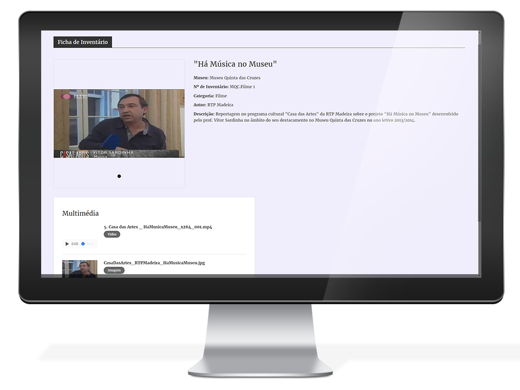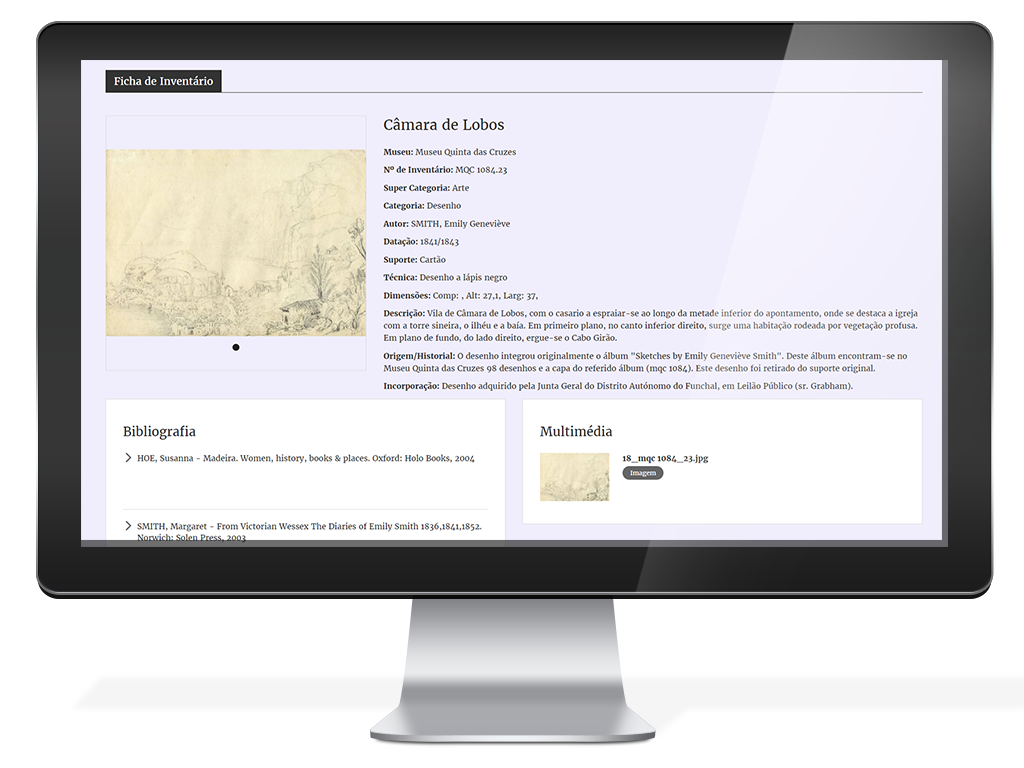 Quando disponíveis, outras informações sobre o bem são apresentadas, na mesma página, Exposições, Bibliografia, Multimédia, Informação associada, registos de inventário associados ao bem e elementos do conjunto a que o bem pertence.