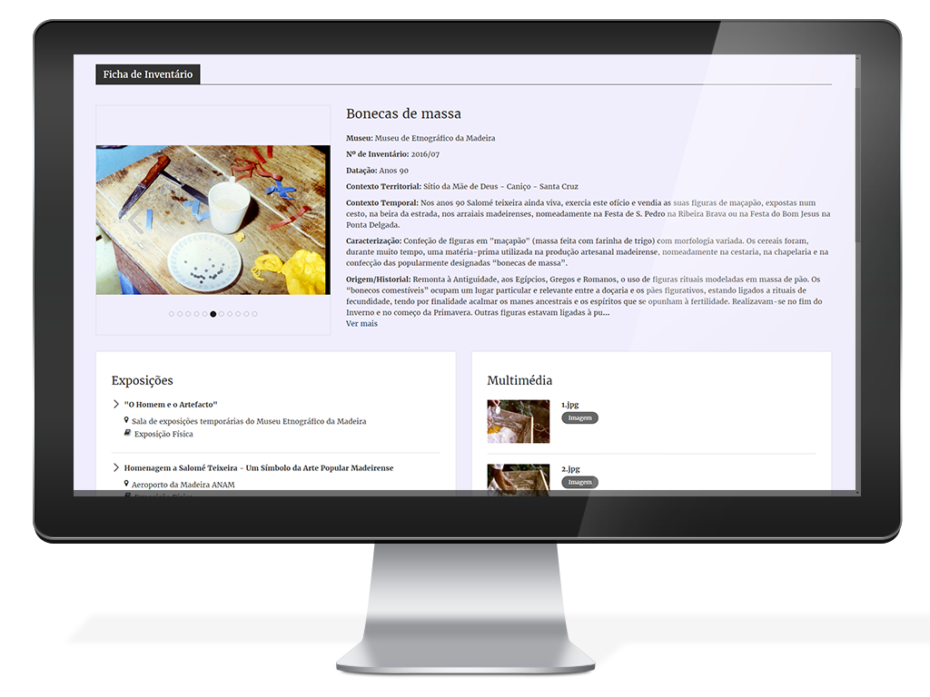 Quando disponíveis, outras informações sobre o bem são apresentadas, na mesma página, Exposições, Bibliografia, Multimédia, Informação associada, registos de inventário associados à manifestação.