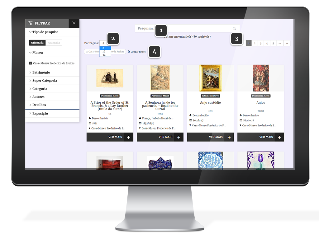 Permite obter todos os registos de património móvel, imaterial, imóvel, fundos documentais e exposições online do Museu selecionado.