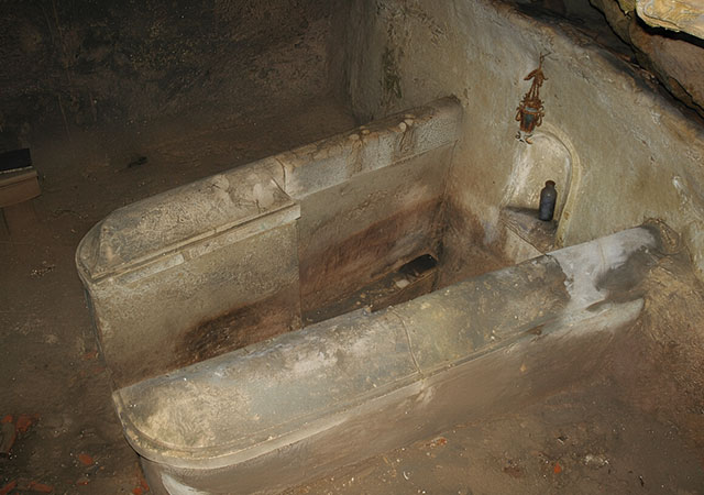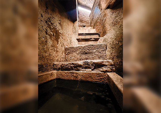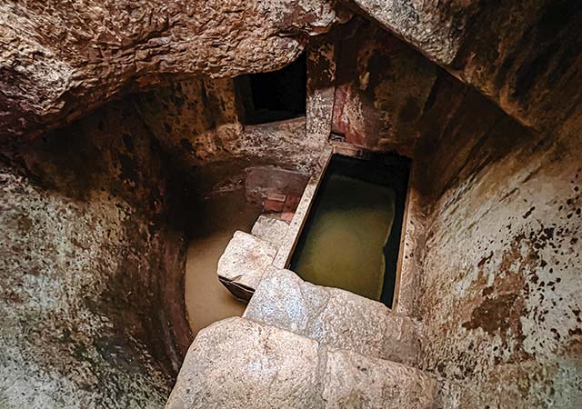 Esta notável estrutura, escavada na rocha a cerca de três metros de profundidade, encontra-se surpreendentemente conservada. Ainda preserva a água corrente e os dois espaços essenciais ao seu funcionamento: a antecâmara de preparação do banho e a piscina, acessível por sete degraus que, na religião judaica, simbolizam os sete dias da criação.